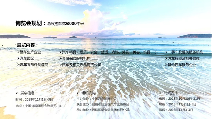 中國汽車流通行業(yè)最權(quán)威會議即將召開(2018 中國汽車流通行業(yè)年會暨博覽會)將于2018年11月1日至3日,在海口國際會展中心舉辦!本次會議3000余人均是全國各地汽車生產(chǎn)、經(jīng)銷企業(yè)高管,是目前中國境內(nèi)最權(quán)威的汽車經(jīng)銷商活動,觀眾涵蓋中國境內(nèi)近20000家汽車4S店,是后市場精品企業(yè)開拓4S渠道精準(zhǔn)推廣機(jī)會!