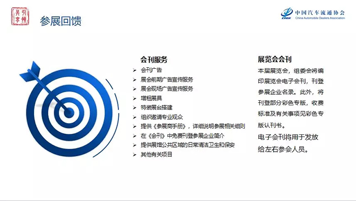 4、所有參展企業(yè)收錄到中國汽車流通協(xié)會后市場精品服務(wù)分會年鑒,并給予給廣告位,年鑒發(fā)放中國汽車經(jīng)銷商年會所有領(lǐng)導(dǎo)。