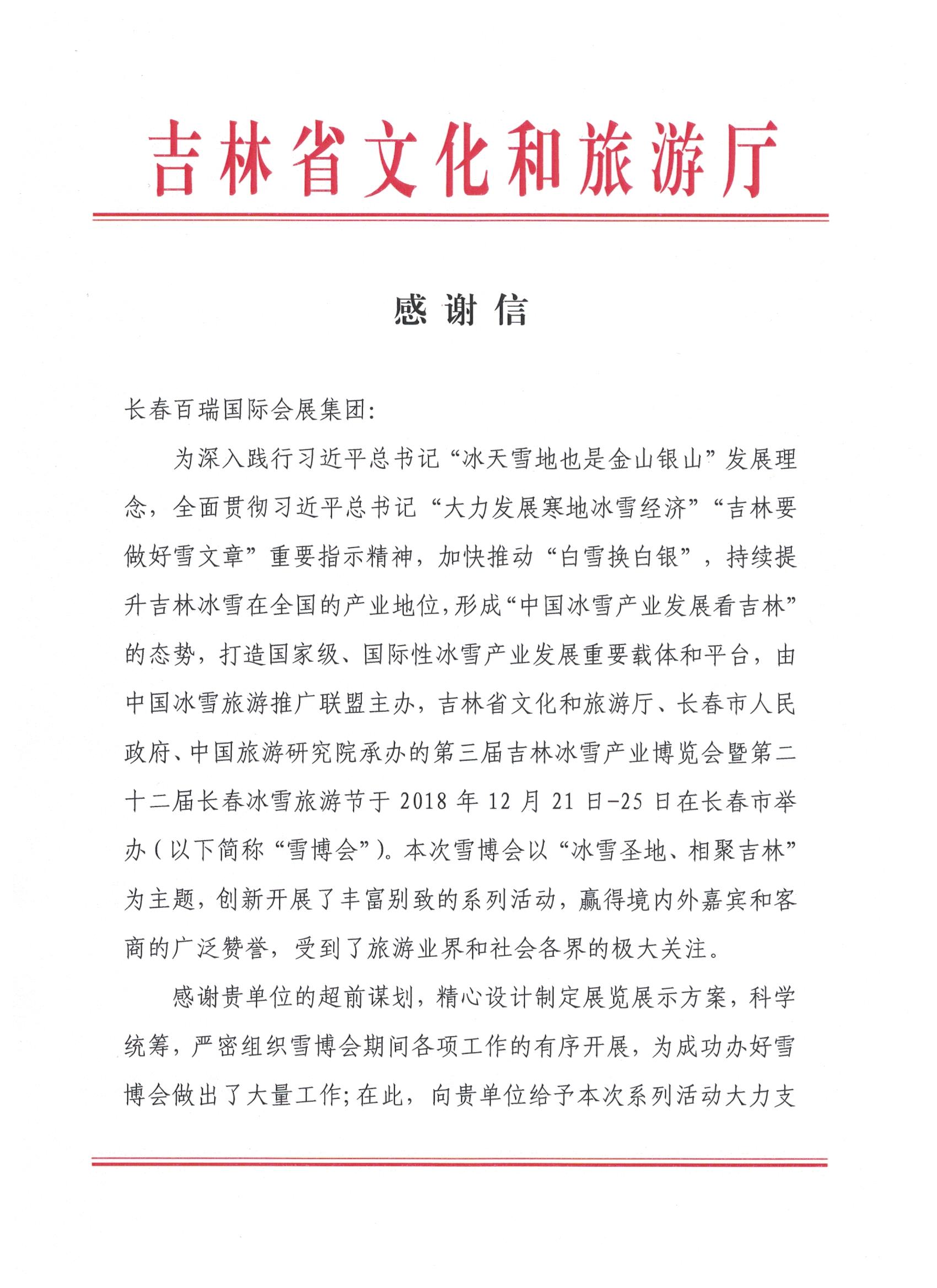 長春百瑞收到來自吉林省文化和旅游廳的表揚(yáng)信