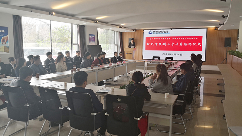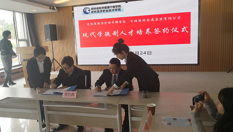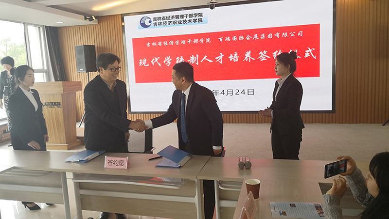 2019年4月24日,百瑞集團(tuán)與吉林省經(jīng)濟(jì)管理干部學(xué)院就“現(xiàn)代學(xué)徒制人才培養(yǎng)”舉行了簽約儀式,百瑞集團(tuán)副總裁胡山、辦公室主任張楊、吉林省經(jīng)濟(jì)管理干部學(xué)院副院長胡伯龍、產(chǎn)教融合處處長孫秋葵以及文化旅游分院的領(lǐng)導(dǎo)、教師、入選學(xué)徒班的同學(xué)以及部分學(xué)生家長參加了此次簽約儀式。