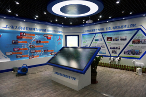 整體風(fēng)格生動活躍,形式豐富。展室的中間設(shè)置了一個超大電子沙盤,可觸控操作,在地圖上查找相關(guān)信息。周圍展示墻面配以生動的圖片展示。仿真動物的裝飾,渲染了氛圍,也強(qiáng)化了主題。